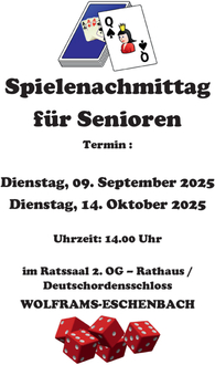 Auch der Spielenachmittag findet wieder wie gewohnt jeweils am zweiten Dienstag im Monat statt. Nach der Sommerpause am Dienstag den 09. September ab 14.00 Uhr im Sitzungssaal des Rathauses.