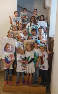 10 Kinder nahmen am Ferienprogramm der Stadt „Workshop Dot Painting” teil. Zuerst wurde ein Keilrahmen grundiert und nach dem Trocknen zeichneten die Kinder mit einer Schablone ein gewünschtes Motiv darauf. Die Farbe wurde dann Punkt für Punkt auf den Keilrahmen getupft. Zum Schluss konnten die Mädchen und Jungen ihre selbstgemachten Kunstwerke mit nach Hause nehmen.