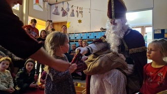 Ganz staunend und aufgeregt begrüßten die Kinder den Bischof Nikolaus, welcher sich nach dem langen Weg erst einmal ausruhen musste, mit Liedern und Gedichten. Mit strahlenden Augen hörten die Kinder aufmerksam zu, als der Nikolaus so einiges aus seinem goldenen Buch zu berichten hatte und nahmen anschließend glücklich die liebevoll befüllten Säckchen von ihm entgegen.