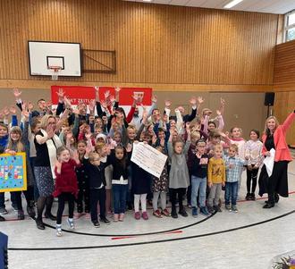 Die Grundschule veranstaltete im vergangenen Schuljahr einen Spendenlauf, bei dem die Kinder die beachtliche Summe von 3.366 Euro erliefen. Ein Spendenziel war schnell gefunden: Im benachbarten Landkreis Main-Spessart erlitt die Stadt Arnstein schweren Schaden durch Hochwasser und Starkregen im vergangenen Mai. Betroffen war auch das Gebäude des kleinen Stadtteilkindergartens Gänheim.