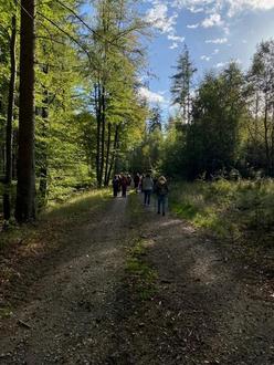 An 2 Samstagen im Oktober sah man eine Gruppe Menschen durch den Wald schlendern. Mal saßen sie unter Bäumen, mal rochen sie an Tannenzapfen und mal standen sie ganz still mit geschlossenen Augen und atmeten den Duft des Waldes ein.