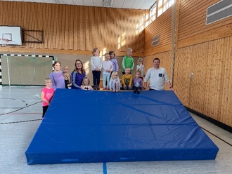 Außerdem konnte dem Wunsch vom Eltern-Kind-Turnen nachgegangen werden und eine Weichbodenmatte für die Turnhalle der Grundschule, die auch von sämtlichen Vereinen genutzt wird, angeschafft werden. Das Eltern-Kind-Turnen gründete sich eigeninitiativ und bietet einmal pro Woche ein offenes Angebot an, seit dem 16.10.2023 auch mit der neuen Weichbodenmatte.