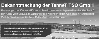 Als zuständiger Übertragungsnetzbetreiber in der Region plant TenneT das Netzausbauvorhaben Fulda-Main-Leitung. Diese neue 380-kV-Leitung soll in Zukunft die Umspannwerke in Dipperz und Mecklar in Hessen mit dem Umspannwerk Bergrheinfeld in Bayern verbinden. Um weitere Details für den künftigen Leitungsverlauf der Fulda-Main-Leitung zu ermitteln, werden im Lauf des Jahres 2024 Kartierungen der Flora und Fauna vorgenommen.