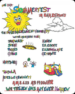 Das Sommerfest findet am 08. Juni 2023, ab 11 Uhr im Kindergarten Zeitlofs statt. Die Aufführung beginnt um 14 Uhr. Für Essen (Metzgerei Böhm), Getränke, Eis, Kaffee und Kuchen ist bestens gesorgt.