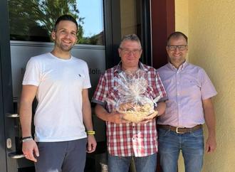 Geschäftsleiter Matthias Klement und 2. Bürgermeister Volker Roth gratulieren Lothar Schöppner zum Dienstjubiläum.