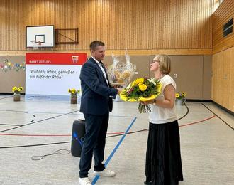Bürgermeister Matthias Hauke überreicht Rektorin Ulla Farkas ein Präsent zum Abschied.