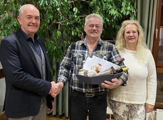 Erster Bürgermeister Karl Gerhard überreicht Herrn Stephan Großer als Dankeschön einen Präsentkorb vom Retschter Lädchen.