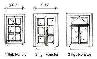 Fenster mit einer Öffnungsbreite von mehr als 70 cm sind als zweiflügelige Holzfensterkonstruktion auszuführen. Bei einer Öffnungsbreite von unter 70 cm können einflügelige Fenster eingesetzt werden.