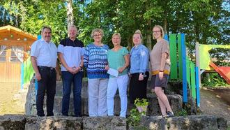 In der KiTA verabschiedeten (von links) 1. Bürgermeister Lorenz Strifsky, 2. Bürgermeister Wolfgang Heß und 3. Bürgermeisterin Ursula Schmidt-Finger die langjährige Mitarbeiterin Liane Rösner gemeinsam mit Leiterin Verena Frank und Stellvertreterin Janine Pfaff in den Ruhestand.