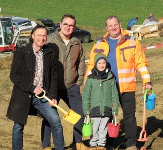 Von links: Bürgermeister Bernhard Uhl, Herr Johnston von der Firma Proludic, und Sachbearbeiter aus dem Bauamt,Tobias Riedel mit einem Kindergartenkind beim Spatenstich und Baubeginn des Spielplatzes.