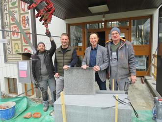 Marktbaumeister Peter Finkenzeller (2. von links) und Bürgermeister Bernhard Uhl (3. von links) mit zwei Mitarbeitern der Firma Hartmuth