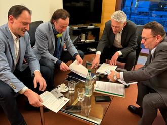 Im Jakob-Kaiser-Haus des Deutschen Bundestages beim Arbeitstreffen zum Regionalhalt in Zusmarshausen (v.li.) MdB Alexander Engelhard, Bürgermeister Bernhard Uhl, MdB Hansjörg Durz und MdB Ulrich Lange (es fehlt MdB Volker Ullrich).