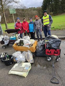 Teilnehmer der Sammelaktion von links: Margot Juraschek, Susanne Hippeli, Bernhard Christl, Andrea Müller, Stefan Vogg. Nicht auf dem Bild; Harry Juraschek, Eugen Wohlgemuth und Anne-Catherine Stegmüller mit Cleo Wohlgemuth.