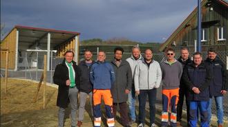 Auf dem Bild ist im Hintergrund das neue Gebäude der stationären Klärschlammentwässerung, der bestehende Zentratspeicher und das Betriebsgebäude zu sehen / Personen von links: Bürgermeister Bernhard Uhl, Bauamtsleiter Peter Finkenzeller, Betriebsleiter Robert Wiedemann, von Steinbacher-Consult Leon Petermann, von der Baufirma Grimbacher Claus Dirr und Georg Grimbacher, Klärwärter Jürgen Bröll, von der Firma Elektrotechnik Hafner Martin Wenninger, Michael Rugel und Markus Thoma