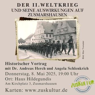 Im bewährten Format werden Dr. Andreas Herch und Archivarin Angela Schlenkrich historische Vorträge halten über den Zweiten Weltkrieg, insbesondere über seine Auswirkungen auf Zusmarshausen. Steinekirch, Streitheim und Wörleschwang kommen dabei ebenfalls in den Blick. Die kampflose Übergabe der Orte war kein „Selbstläufer“, engagierte Bürger machten dies erst möglich.