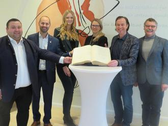 von links: Bürgermeister Sebastian Bernhard (Gemeinde Adelsried), Bürgermeister Andreas Weißenbrunner (Gemeinde Kutzenhausen), die beiden Standesbeamtinnen aus Zusmarshausen Sarah Ruhland und Julia Gewitsch, Bürgermeister Bernhard Uhl (Marktgemeinde Zusmarshausen) sowie der Standesbeamte aus Kutzenhausen Fridolin Klemmer
