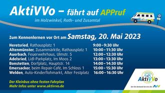 An zwei Terminen haben Sie Gelegenheit, den Bus vor Ort kennen zu lernen und sich über das Buchungssystem und die Handhabung der Buchungs-App zu informieren. Am 4. Juni 2023wird der AKtiVVo beim Frühjahrsmarkt Zusmarshausen mit einem Stand vorgestellt. Bereits am 20. Mai 2023 werden Mitarbeitende des AVV mit dem Fahrzeug die Gemeinden der Region Holzwinkel und Altenmünster sowie Auerbach mit dem Bus anfahren. Zu folgenden Zeiten haben Sie die Möglichkeit, das Fahrzeug anzutreffen: