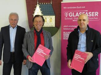 Foto: Bei der Unterzeichnung einer gemeinsamen Erklärung zum eigenwirtschaftlichen Glasfaserausbau: von links nach rechts Gernot Ritter (Breitbandpate), Bernhard Uhl (Erster Bürgermeister), Thilo Kurtz (Vertragsmanager Deutsche Telekom)