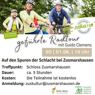 Die letzte große Schlacht des Dreißigjährigen Krieges am 17. Mai 1648 ist als "Schlacht bei Zusmarshausen" in die Geschichte eingegangen. Auf einer Fahrradtour entlang der historischen Kampfplätze von Zusmarshausen bis zur Biburger Mühle informiert Heimatforscher Guido Clemens über das jeweilige Geschehen. Nach einer Rast auf dem Gelände der Biburger Mühle geht es über Rommelsried, Häder und Dinkelscherben zurück zum Ausgangspunkt. Die Fahrtstrecke beträgt rund 40 Kilometer.
