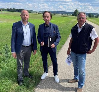 von links: Bürgermeister Florian Mair (Altenmünster), Bürgermeister Bernhard Uhl (Zusmarshausen) und Bürgermeister Edgar Kalb (Dinkelscherben) vor dem geplanten Staubereich beim Hochwasserrückhaltebecken Siefenwang