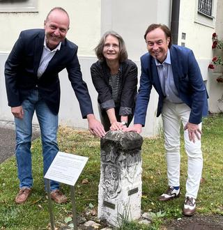 Der Grenzstein von Wollbach aus dem Jahr 1609 ist öffentlich zugänglich und kann vor dem Augsburger staatlichen Vermessungsamt bewundert werden. Amtsleiter Thomas Gruber zeigte den Grenzstein Archivarin Angela Schlenkrich und Bürgermeister Bernhard Uhl aus Zusmarshausen.