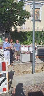 Von links: Bürgermeister Bernhard Uhl, Marktbaumeister Peter Finkenzeller und Sachbearbeiter Robert Wiest überprüfen die Baustelle am Marktplatz