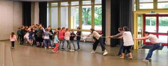 Für allgemeine Heiterkeit sorgte dann das Tauziehen einer Mannschaft der Kinder gegen den Elternbeirat. Im Anschluss durften die Kinder dann einige Spielstationen durchlaufen. Bei Tauziehen, Torwandschießen, Sackhüpfen usw. konnten sie ihre Kräfte messen.