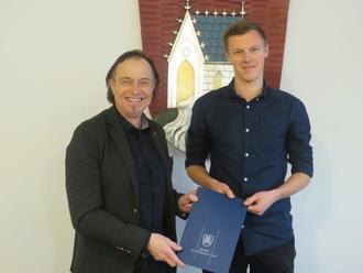 Bürgermeister Bernhard Uhl (links) gratuliert dem neuen Geschäftsstellenleiter Jonas Watzal (rechts) zu seiner Ernennung
