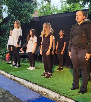 Nach unzähligen Übungsstunden hieß es am 24.07.2023 dann endlich: „Vorhang auf!“ Den Vorhang suchte man im Griechischen Theater in Heretsried zwar vergeblich, dafür war ein großes Publikum zu finden, das sich trotz des unbeständigen Wetters an diesem Tag auf die Vorstellung freute. Die Bereitschaft aller Anwesenden, im Zweifelsfall ein paar Regentropfen abzubekommen, wurde belohnt und so konnte das 30-minütige Stück im Trockenen aufgeführt werden. Als Panther, Zoobesucher oder Busfahrer traten die Kinder und Jugendlichen in Aktion. Der donnernde Applaus, der darauffolgte, zeugte von großer Begeisterung des Publikums. Im Anschluss gab es die Möglichkeit, Nachfragen zu einzelnen Szenen zu stellen, welche die Schülerinnen und Schüler ohne jedes Zögern beantworteten.