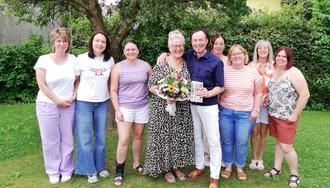 Renate Pace (4. von links) bei ihrer Verabschiedung mit Bürgermeister Bernhard Uhl (5. von links) inmitten ihrer Kolleginnen aus der Mittagsbetreuung.