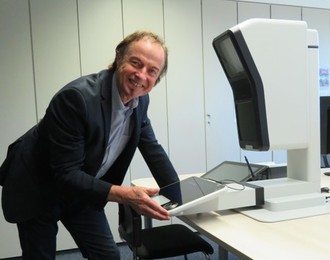 Bürgermeister Bernhard Uhl testet das neue Lichtbildaufnahmegerät