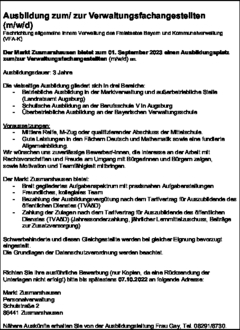 Der Markt Zusmarshausen bietet zum 01. September 2023 einen Ausbildungsplatz zum/zur Verwaltungsfachangestellten (m/w/d) an.