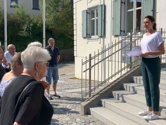 Kulturbeauftragte Julia Endrös vor dem ehem. Pfarrhof bei der Begrüßung der Führungsteilnehmerinnen und -teilnehmer.