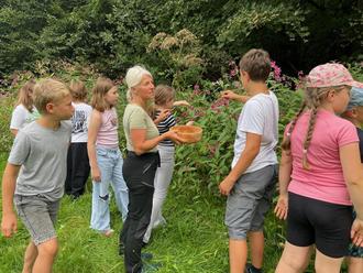 Schon nach kurzer Zeit wurde klar, dass es am Wegesrand viel mehr zu sehen und zu lernen gibt, als man auf den ersten Blick vermutet. Karin Strobel erklärte anschaulich, welche Kräuter essbar sind, welche Heilkräfte sie besitzen und worauf man beim Sammeln achten sollte. Mit großem Interesse probierten die Kinder verschiedene Blätter, schnupperten an Blüten und staunten, wie vielfältig unsere Natur ist. Besonders spannend war der Hinweis, dass man selbst die Brennnessel als Salat oder einfach auf das Butterbrot legen kann – eine echte Überraschung für viele.