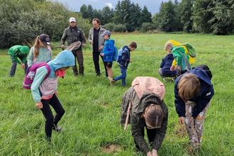 Ranger Stefan Schonath und Bürgermeister Bernhard Uhl (hi.) bei der Erlebniswanderung des Kinderferienprogramms in der Zusamaue. Die Kinder suchen eine Sumpfschrecke.