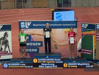 Um einiges professioneller in der Besetzung sind die Südbayerischen Hallenmeisterschaften, zu denen sie am vergangenen Wochenende antrat. In einer starken Konkurrenz in der Altersklasse W15 lief sie in der Paul-Linde-Halle in München über 800 Meter in 2:33,39 ins Ziel. Das ist nicht nur ihre neue Bestleistung, sondern bedeutete für sie auch die Silbermedaille. Außerdem hält sie damit den neuen Vereinsrekord der Altersklasse U16.