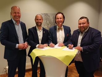 von links: Landrat Martin Sailer, Bürgermeister Andreas Weißenbrunner, Bürgermeister Bernhard Uhl und Bürgermeister Sebastian Bernhard bei der Unterzeichnung der Vereinbarung zur Zusammenlegung der Standesämter