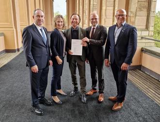 (v.l.) Wirtschaftsminister Hubert Aiwanger, Abgeordnete Marina Jakob, Bürgermeister Bernhard Uhl mit einer Kopie der Petition, der künftige Digitalminister Dr. Fabian Mehring und Abgeordneter Anton Rittel beim Treffen im Bayerischen Landtag.
