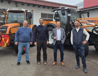 Von links: Bauhofleiter Tobias Riedel, Geschäftsführer Hans-Philipp Ayrle, Bürgermeister Bernhard Uhl und Marktbaumeister Peter Finkenzeller bei der Anlieferung des neuen Schleppers.