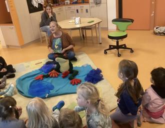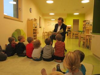 Die Beiden hatten spannende Vorlesegeschichten im Gepäck, mit tanzenden Fröschen und Käse essenden Hühnern. Frau Hander-Patternoster hatte sogar ihren Frosch „Flemming“ in großer Kuscheltierform dabei, was die Kinder zusätzlich zum Mitfiebern brachte. Von Herrn Bürgermeister Uhl gab es zum Abschluss noch eine Überraschung von der Henne Frieda.