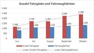 Seit Projektstart wurden bereits über 9.200 Fahrgäste auf insgesamt 5.595 Fahrten befördert. Fahrtwünsche mit einer ähnlichen Route werden, falls möglich, gebündelt. Auch hier zeigt die Auswertung deutlich, dass auch die sogenannte Pooling-Quote kontinuierlich steigt, d.h. es werden inzwischen immer mehr Fahrgäste mit weniger Fahrten befördert. So werden unnötige Fahrtwege reduziert und die Umwelt geschont.