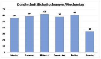 Die Auswertung zeigt, dass die einzelnen Tage kaum Unterschiede in der Anzahl der Buchungen aufweisen. Lediglich Samstag fällt die durchschnittliche Anzahl der Buchung ab – allerdings sind hier auch kürzere Bedienzeiten hinterlegt. Über alle Bedientage erreicht der AktiVVo im Holzwinkel im Durchschnitt 55 Buchungen/Tag