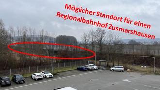 Das Foto zeigt die Lärmschutzwand auf der Nordseite der Autobahn. Im eingekreisten Bereich in der Nähe des Unternehmens „Chefs Culinar“ könnte beim Ausbau der Bahnstrecke Ulm-Augsburg mit der hellorangen Trasse der Regionalbahnhof im Zusamtal entstehen