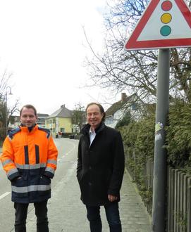 Bürgermeister Bernhard Uhl und Robert Wiest aus dem Sachgebiet „Planen und Bauen“ vor dem bereits montierten Gefahrzeichen, das auf die Lichtzeichenanlage hinweisen soll.