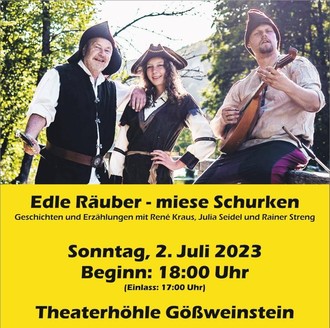Am 02. Juli 2023 belebt der Förderverein Höhenschwimmbad Gößweinstein e.V. die Theaterhöhle mit dem Stück „Edle Räuber – miese Schurken“! Die Kulisse scheint wie gemacht dafür zu sein, Figuren der Räuber- und Gaunerliteratur wie den „Schinderhannes“, „Rinaldo Rinaldini“ oder die „Räuber aus dem Spessart“ zum Leben zu erwecken. Hinter alledem stecken der Schauspieler und Regisseur Rainer Streng (Kulturpreisträger der Stadt Forchheim 2021) und der Schauspieler und Musiker René Kraus (Soundartist des Jahres 2019). Den weiblichen Part in der Räuberbande übernimmt Julia Seidel (bekannt vom shakespeare project des Jungen Theaters).