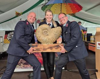 Im Anschluss fanden im Festzelt die offiziellen Ansprachen und Glückwünsche statt. Unsere Vorsitzende Elisa Egelseer-Bogner überbrachte die herzlichsten Grüße aus Gößweinstein und überreichte ein ganz besonderes Präsent: einen etwa 160 Millionen Jahre alten Fossil – eine symbolische Gabe zum 160-jährigen Bestehen und Ausdruck der langjährigen Verbundenheit zwischen unseren Feuerwehren.