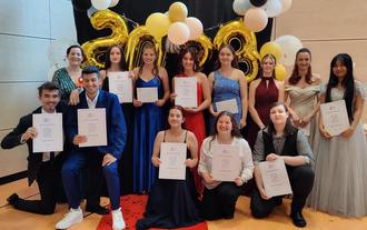 Kaum wieder zurück, stand schon der Tanzkurs gemeinsam mit der 9. Klasse und einigen ukrainischen Schülern aus der Brückenklasse 9/10 auf dem Plan, denn am Tage der Abschlussfeier sollte auch der Tanzkursabschlussball stattfinden. Unter Anleitung von Tanzlehrern des Tanzstudios Steinlein erlernten die jungen Tänzerinnen und Tänzer sechs Tänze: Langsamer Walzer, Wiener Walzer, Tango, Cha-Cha-Cha, Discofox und auch der freie Tanz standen auf dem Plan. Hier zeigte sich wieder: Nicht für die Schule, sondern fürs Leben wird gelernt!