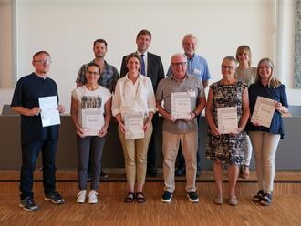 Die Kulturpatinnen und Kulturpaten des Landkreises Forchheim bei der Übergabe ihrer Zertifikate (vordere Reihe v.l.n.r.): Herbert Hopfner, Miriam Leisterer, Christina Glietz, Peter Lutz, Dr. Gudrun Schüpferling und Gabriele Stieg, (nicht auf dem Bild: Gitta Hahn), mit (hintere Reihe v.l.n.r): Moritz Wenninger (Kultur- und Sportamt des Landkreises Forchheim), Landrat Dr. Hermann Ulm (Landrat des Landkreises Forchheim), Georg Weigl (Curatorium Altern gestalten) und Sandra Wolf (Oberfranken Offensiv e.V.).