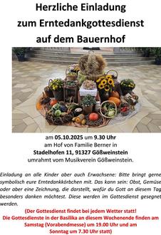 Die Pfarrei St. Erhard Wichsenstein organisiert auch in diesem Jahr wieder eine Buswallfahrt. Unser Ziel ist heuer Regensburg. Unser Kirchenpatron, der heilige Erhard liegt dort begraben. Die Wallfahrt ist für Sonntag den 5. Oktober 2025 geplant. Nähere Information zum Ablauf geben wir im nächsten Pfarrbrief bekannt. Wir freuen uns jetzt schon auf eine rege Teilnahme, auch aus den umliegenden Ortschaften. Bitte den Termin jetzt schon vormerken.