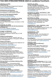 Die Veranstaltungen sind größtenteils kostenlos oder gegen eine geringe Gebühr zugänglich. Weitere Details und das vollständige Programm finden Sie unter www.lra-fo.de/tagderstreuobstwiese